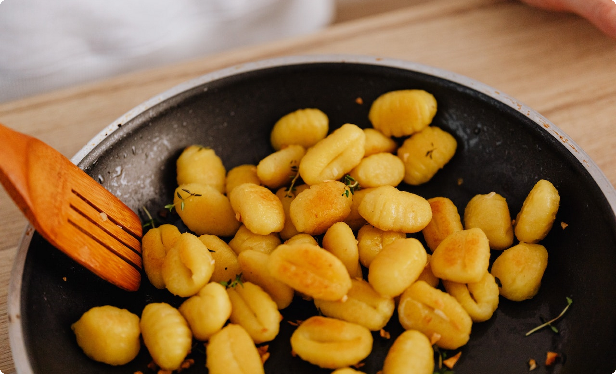 - In a large skillet over medium heat, melt the butter until it turns golden brown and has a nutty aroma. Add the cooked gnocchi to the skillet and toss to coat them in the butter.